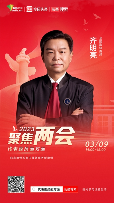 中國青年網北京3月9日電(記者 薛艷麗)3月9日,全國政協委員,河北省律師協會副會長,北京德恒(石家莊)律師事務所律師齊明亮做客中國青年網聯合今日頭條舉辦的線上“2023代表委員面對面”微訪談活動,和大家分享今年全國兩會期間自己帶來的提案。