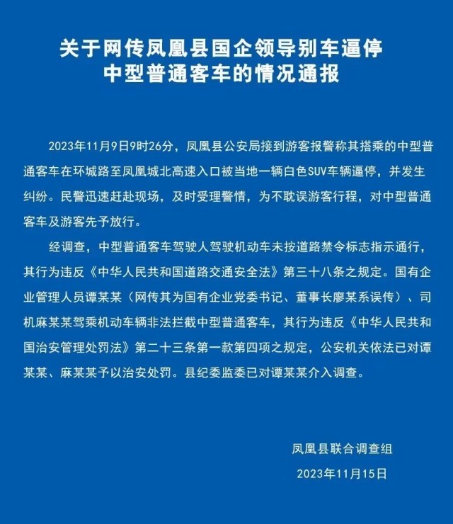 央視網(wǎng)消息:據(jù)鳳凰融媒微信公眾號消息,11月15日,鳳凰縣聯(lián)合調(diào)查組發(fā)布情況通報,經(jīng)調(diào)查,中型普通客車駕駛?cè)笋{駛機(jī)動車未按道路禁令標(biāo)志指示通行,其行為違反相關(guān)規(guī)定。國有企業(yè)管理人員譚某某 (網(wǎng)傳其為國有企業(yè)黨委書記、董事長廖某系誤傳)、司機(jī)麻某某駕乘機(jī)動車輛非法攔截中型普通客車,其行為違反相關(guān)規(guī)定,公安機(jī)關(guān)依法已對譚某某、麻某某予以治安處罰。縣紀(jì)委監(jiān)委已對譚某某介入調(diào)查。