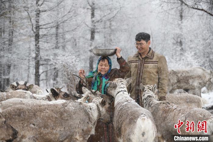 資料圖。圖為2023年4月29日,在內蒙古大興安嶺,柳霞與兒子雨果在雪中給馴鹿喂食豆餅。 王偉 攝