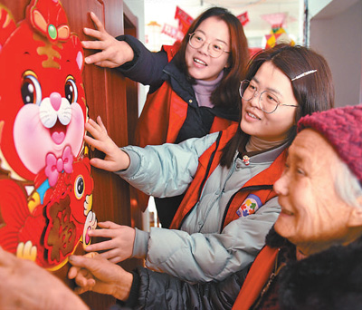 近日,安徽省當(dāng)涂縣五彩社會工作服務(wù)中心的志愿者與空巢老人一起貼年畫,為老人家增添節(jié)日喜慶氣氛。