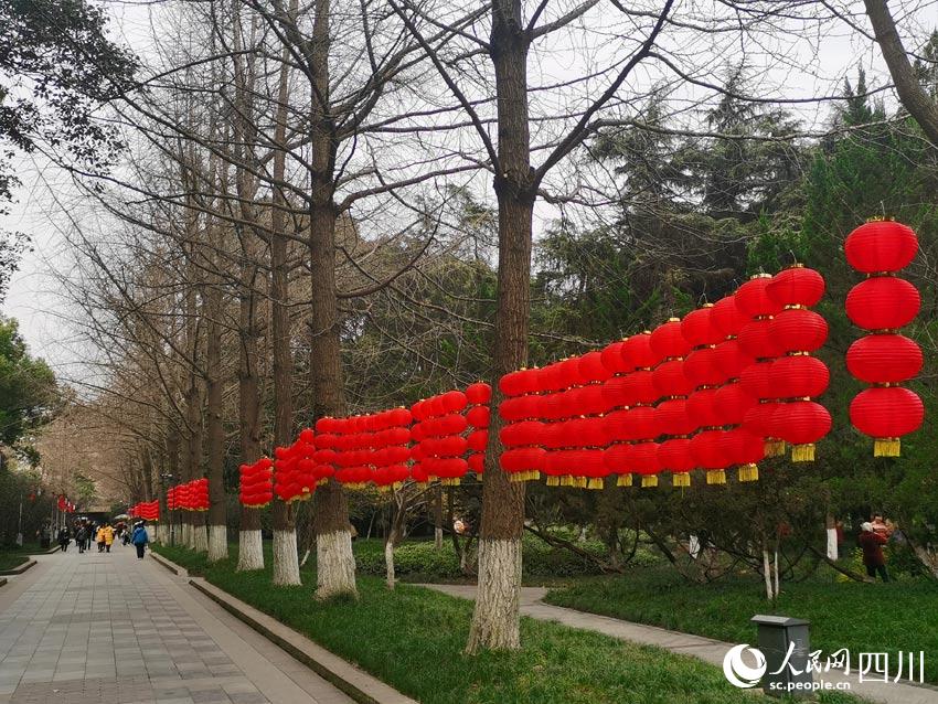 公園的大門布置成了喜慶的大紅色,門上門旁掛滿了紅燈籠。一串四個紅燈,既可以理解為“四季平安”,也可以理解為“四季發財”,還可以理解成“四平八穩”……中國文化的詩意內涵,可以激發出人們更多的想象力。