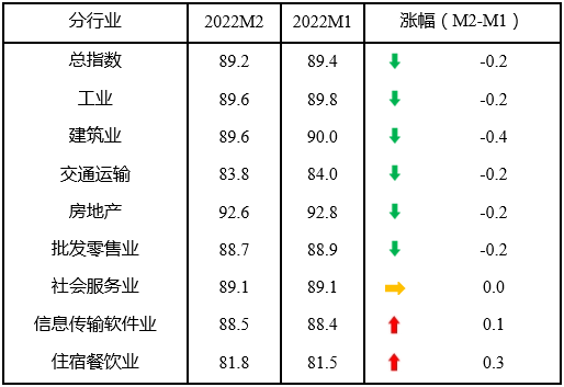 其中,分行業指數2升1平5降,分項指數2升6降。在8個分行業指數中,升幅較大的為住宿餐飲業指數,上升0.3點;降幅較大的為建筑業指數,下降0.4點。在8個分項指數中,升幅較大的為資金指數,上升0.4點;降幅較大的為成本指數和投入指數,均下降0.7點。