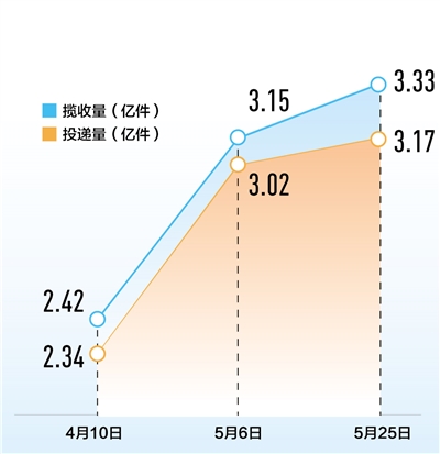 4月10日以來,各地各部門多措并舉保通保暢,全國停運的郵政快遞分撥中心和郵件快件積壓數均大幅下降。5月6日,全國郵件快件攬收、投遞量均恢復至3億件以上;5月28日,郵件快件攬收量約為3.14億件,投遞量約為3.22億件,均超過去年同期水平。