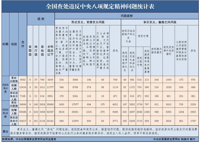 據(jù)介紹,為掌握全國貫徹落實(shí)中央八項(xiàng)規(guī)定精神情況,中央紀(jì)委國家監(jiān)委在各省區(qū)市和新疆生產(chǎn)建設(shè)兵團(tuán)、各中央和國家機(jī)關(guān)、各中央企業(yè)和中央金融企業(yè)等建立了落實(shí)中央八項(xiàng)規(guī)定精神情況月報(bào)制度。2020年以來,截至4月30日,全國查處違反中央八項(xiàng)規(guī)定精神問題情況如下: