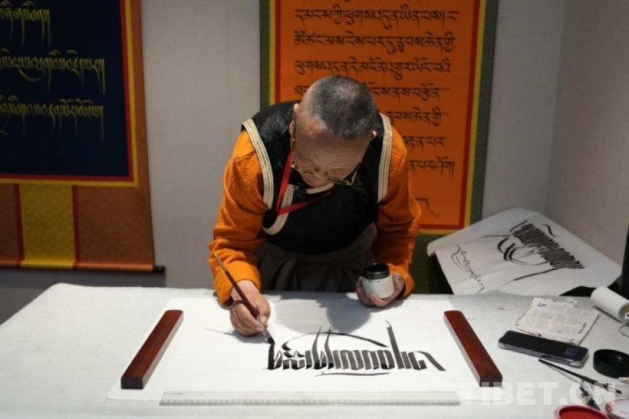 圖為第二屆“文化原鄉(xiāng) 福地壤塘”2025北京行活動(dòng)期間,參展者為觀眾展示藏文書法技藝 攝影:王茜