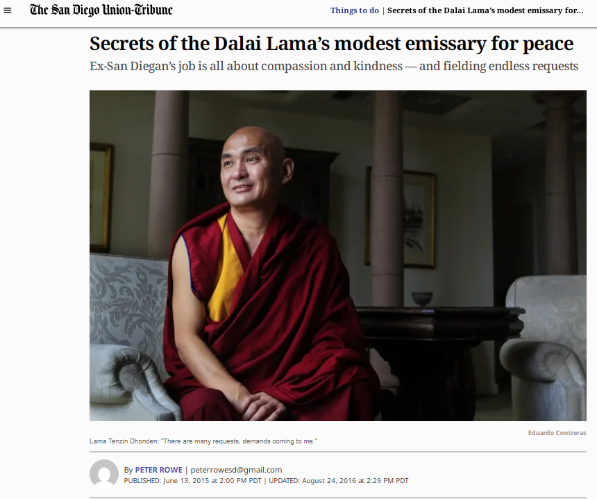 2015年丹增東登接受美國《圣地亞哥聯合論壇報》采訪。該媒體當時稱其為“達賴喇嘛謙遜的和平使者”,現在讀來頗感諷刺。