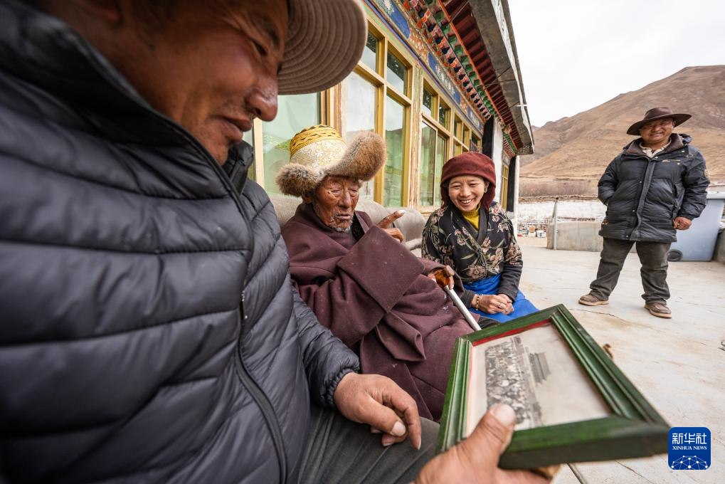 索扎老人和家人觀看當年在天安門前拍的照片(3月20日攝)。新華社記者 丁增尼達 攝
