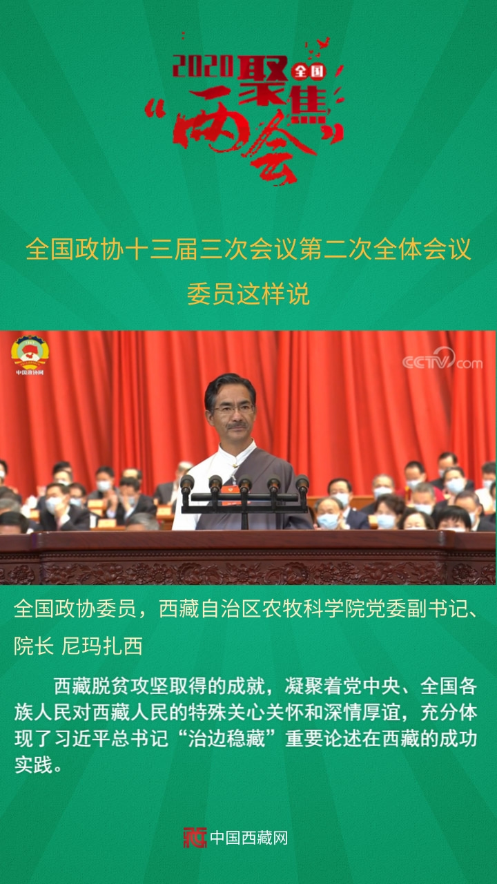 全國政協(xié)委員,西藏自治區(qū)農(nóng)牧科學(xué)院黨委副書記、院長尼瑪扎西發(fā)言說,西藏脫貧攻堅取得的成就,凝聚著黨中央、全國各族人民對西藏人民的特殊關(guān)心關(guān)懷和深情厚誼,充分體現(xiàn)了習(xí)近平總書記“治邊穩(wěn)藏”重要論述在西藏的成功實踐。