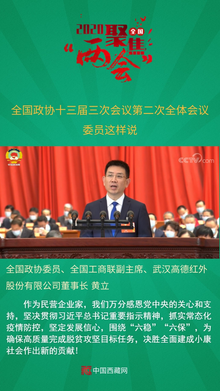 全國政協(xié)委員、全國工商聯(lián)副主席、武漢高德紅外股份有限公司董事長黃立發(fā)言說,作為民營企業(yè)家,我們?nèi)f分感恩黨中央的關(guān)心和支持,堅決貫徹習(xí)近平總書記重要指示精神,抓實常態(tài)化疫情防控,堅定發(fā)展信心,圍繞“六穩(wěn)”“六保”,為確保高質(zhì)量完成脫貧攻堅目標任務(wù),決勝全面建成小康社會作出新的貢獻!