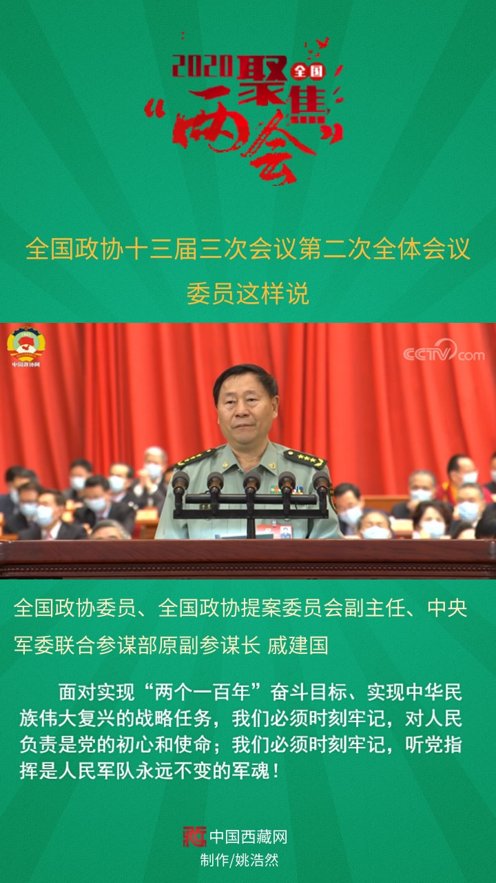 全國政協(xié)委員、全國政協(xié)提案委員會副主任、中央軍委聯(lián)合參謀部原副參謀長戚建國發(fā)言說,面對實現(xiàn)“兩個一百年”奮斗目標、實現(xiàn)中華民族偉大復(fù)興的戰(zhàn)略任務(wù),我們必須時刻牢記,對人民負責(zé)是黨的初心和使命;我們必須時刻牢記,聽黨指揮是人民軍隊永遠不變的軍魂!