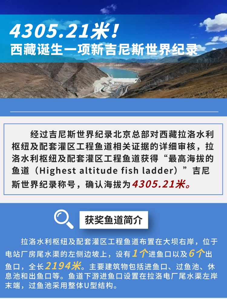 拉洛水利樞紐及配套灌區(qū)工程魚道獲得“最高海拔的魚道(Highest altitude fish ladder)”吉尼斯世界紀(jì)錄稱號,確認(rèn)海拔為4305.21米。 [詳細(xì)]