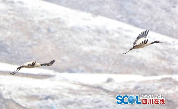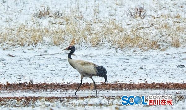 看到眼前這一幕,紅原縣第三眼攝影家協會的攝影師榮修楚臣忙用鏡頭記錄下這珍貴的瞬間。“今天拍到了10多只黑頸鶴,是今年飛回來的首批黑頸鶴。可能是下雪的原因,往年這個時間點會有幾十只。”榮修楚臣說,估計還要等兩天,飛回來的黑頸鶴就會多起來。