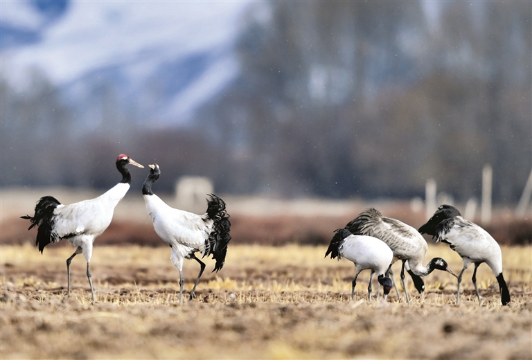 圖為在西藏林周縣黑頸鶴自然保護區里棲息覓食的黑頸鶴。 新華社記者 張汝鋒攝