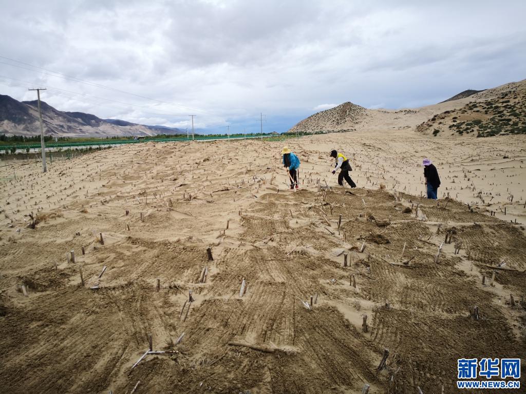 在山南市雅魯藏布江河谷地帶,村民們在維護固沙用的草方格(2019年7月14日攝)。新華社發(資料照片)