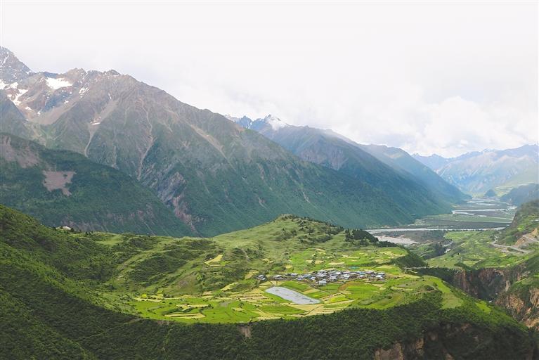 圖為7月11日遠眺邊壩縣金嶺鄉,滿目綠色、植被繁茂。記者 桑鄧旺姆 攝