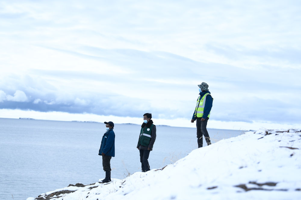 2021年10月20日,在青海省果洛藏族自治州瑪多縣扎陵湖鄉(xiāng)勒那村,三江源國家公園黃河源園區(qū)生態(tài)管護員在扎陵湖畔巡護。新華社記者 李占軼 攝