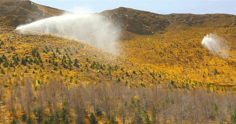 圖為拉薩南北山綠化工程的自動智能澆水系統在給寶瓶山樹林澆水。 記者 格桑倫珠 實習生 達娃宗巴 攝