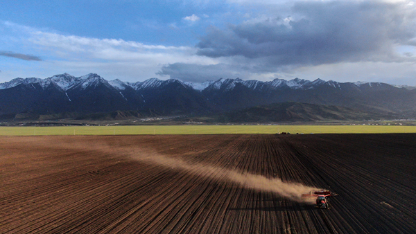 青海省三江集團門源種馬場的工人駕駛農機在油菜田里播種(無人機照片)。記者 張宏祥 攝