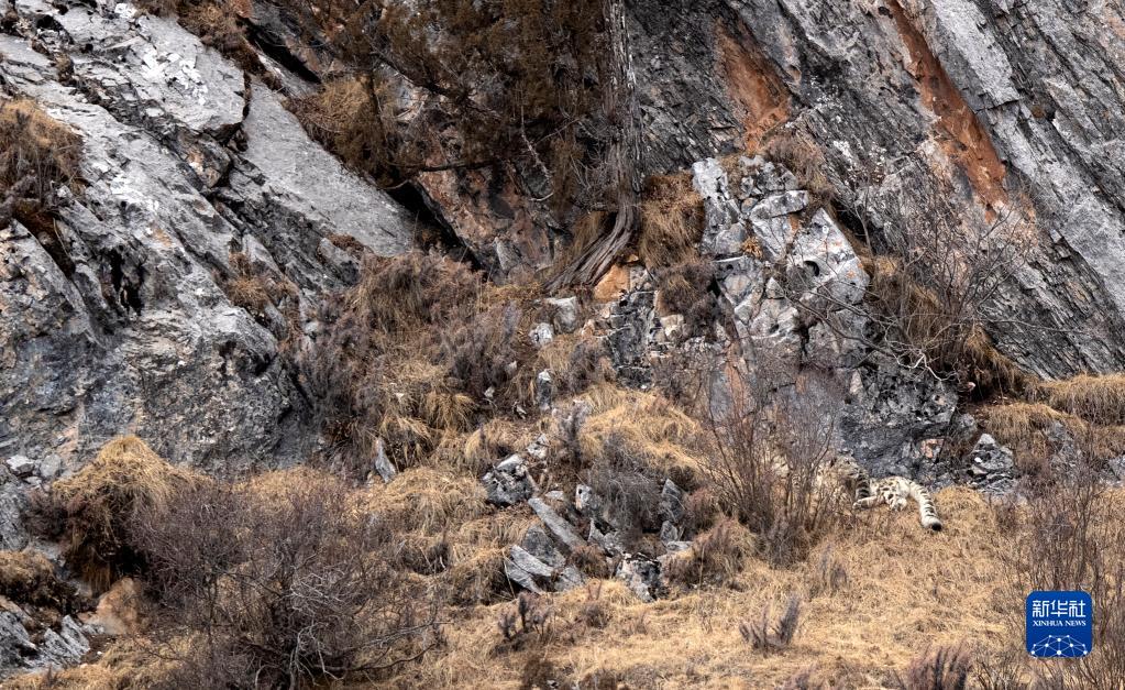 2月21日,在青海省玉樹藏族自治州雜多縣昂賽鄉境內的昂賽大峽谷內,一只雪豹在休息。新華社記者 費茂華 攝