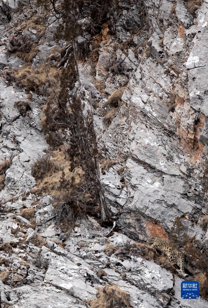 2月21日,在青海省玉樹藏族自治州雜多縣昂賽鄉境內的昂賽大峽谷內,一只雪豹在向上攀爬。新華社記者 費茂華 攝