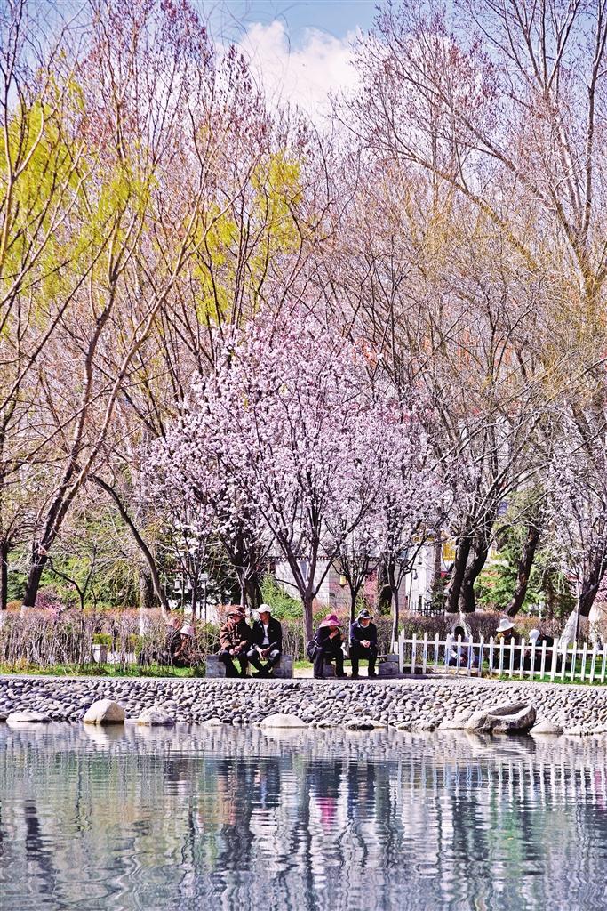 那么,去哪里查收這份“春日限定大禮包”呢?最近幾天,記者的朋友圈都被帕崩崗的美景霸屏了,一波又一波的朋友到這里打卡。除了去帕崩崗賞桃花,更不容錯過的一定是拉薩大街小巷以及公園中驚鴻一瞥的美景。宗角祿康公園植被繁茂、古樹較多,一到春季,玫粉色的榆葉梅綻放枝頭,層層花瓣在陽光的照耀下嬌俏動人,一樹粉色花朵倒映在幽綠的湖水中,盡顯詩意。此外,緊鄰羅布林卡的羅堆東路也有意想不到的美景,每到這個季節,紅葉李便會沿路盛開,淡粉色的花瓣搭配深紅色的花蕊,甚是好看。金珠西路沿途的景色也令人耳目一新,淡粉色的花朵肆意綻放,等紅燈時的心情因這些花朵變得不再焦灼。