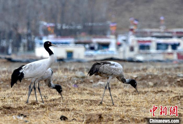黑頸鶴是全球十五種鶴類中唯一在高原地區繁殖和越冬的鶴類,被譽為“高原神鳥”,屬中國國家一級保護動物。每年10月中下旬左右,黑頸鶴陸續飛抵雅魯藏布江中游河谷等地越冬。圖為3月8日,西藏拉薩林周縣黑頸鶴保護區,黑頸鶴在田間覓食。中新社記者 李林 攝