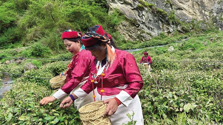 換上五彩門巴服飾,挎上小竹簍,指尖輕掐嫩芽,翠綠茶田里的一抹斑斕身影,隨便一拍都像畫報!