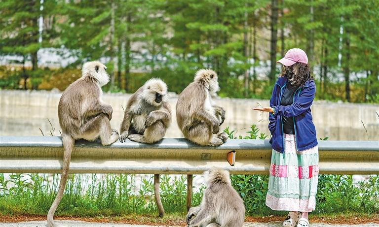 圖為6月20日,在亞東縣一條公路邊,游客在和長尾葉猴互動。新華社記者 丁增尼達 攝