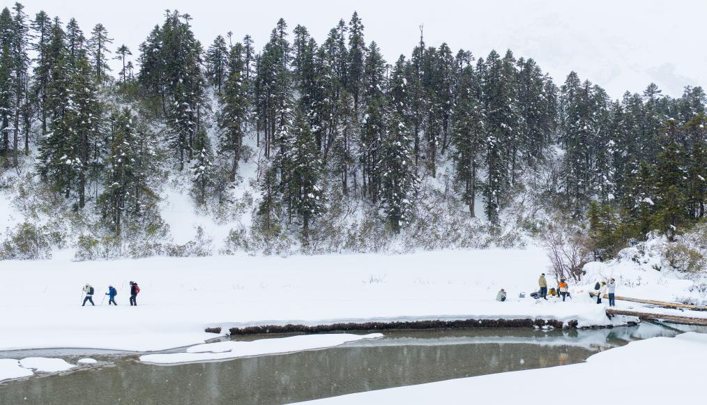 游客們一路走走停停,拍照、駐足、感嘆。因風雪較大,到牧場的2公里路就走了整整一小時。但沒有人放棄,也沒有人覺得遺憾——白普隆溝的美,不在于抵達終點,而在于每一步都有驚喜。