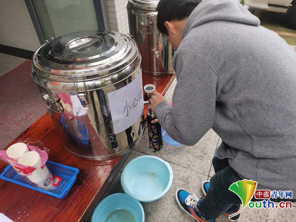 圖為學生正在飲用“大鍋湯”。中國青年網通訊員 沈萌萍 攝