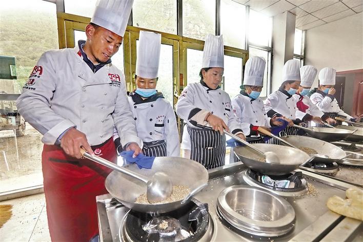 圖為在培訓(xùn)班上,學(xué)員在學(xué)習(xí)炒菜。次旺 唐斌 攝