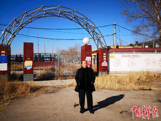 杜潤拴站在原崇實中學校門口。江山 攝