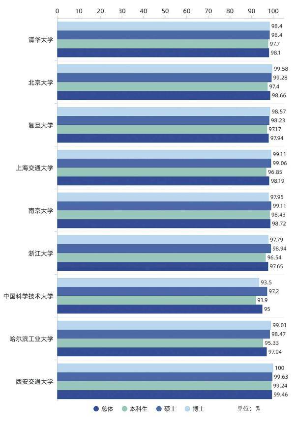 其中,最高的是西安交通大學,畢業生就業率達99.46%;最低的是中國科學技術大學,畢業生就業率為95%。