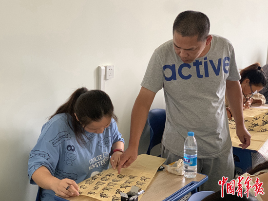 蔡偉在書法課上指導學生。王景爍攝