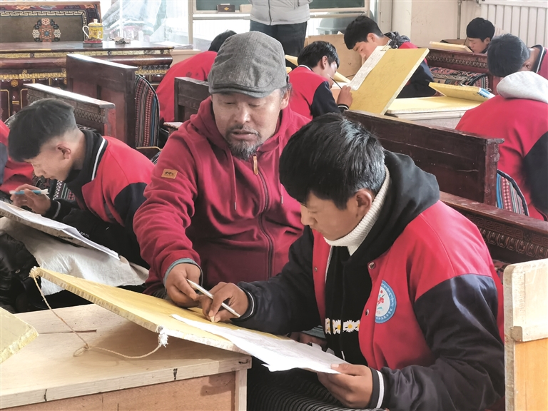 圖為唐卡車間的老師正在指導學生唐卡繪制的起稿和線描技藝。凃瓊 攝