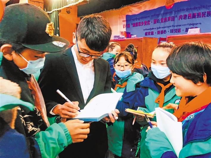 宣講活動過程中,共青團西藏自治區委員會副書記格桑卓瑪、西藏青年報社副社長洛桑頓珠給6所學校內地西藏班的學生們贈送了《西藏青年報》《西藏青年》等刊物和書籍。格桑卓瑪語重心長地囑咐孩子們:“作為新時代的新青年,要時刻牢記時代賦予的新使命,要用新時代的標尺審視自己,用科學文化武裝自己,淡化宗教消極影響,在新征程的熔爐中鍛造自己,努力使自己成為堪當民族復興大任的新青年,在全面建設社會主義現代化國家新征程中貢獻自己的青春力量,做神圣國土的守護者、幸福家園的建設者,在青春的閃光中踐行‘感黨恩、愛核心、聽黨話、跟黨走’的家國情懷。”