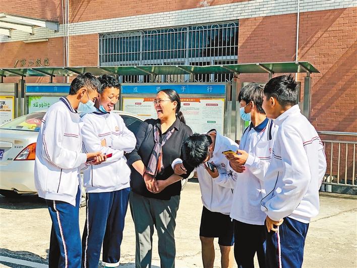 西藏大學理學院教授、博士生導師、內地西藏班優秀畢業生代表黃香(左三)與內地西藏班學生進行交流。