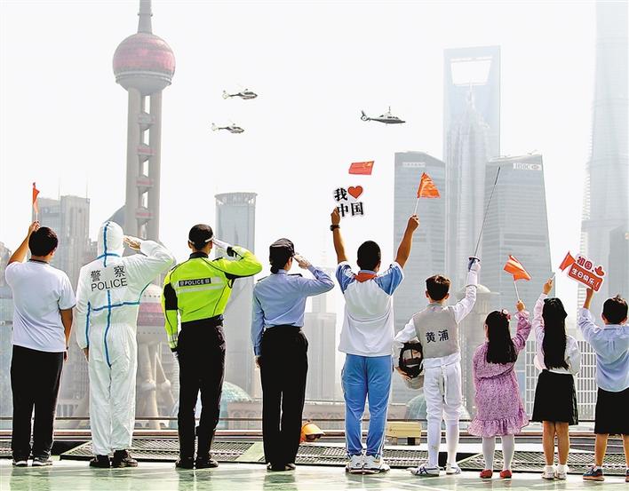 10月1日,警用直升機(jī)懸掛著五星紅旗飛過上海黃浦江上空。新華社記者 陳飛 攝