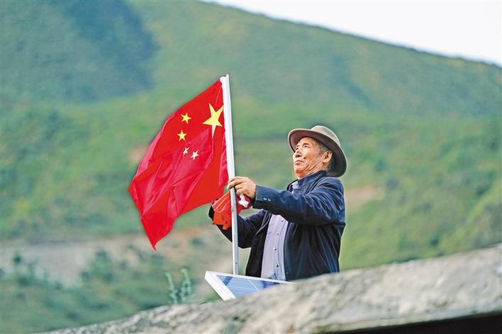 9月25日,在西藏昌都市江達(dá)縣崗?fù)写澹瞻驮谖蓓斏蠐Q上嶄新的國(guó)旗,這是他每月進(jìn)行一次的“儀式”。今年是昌都解放70周年,普巴說,現(xiàn)在我們的美好日子,是解放軍用生命和鮮血換來的,這份恩情,我們不會(huì)忘記。新華社記者 詹彥 攝