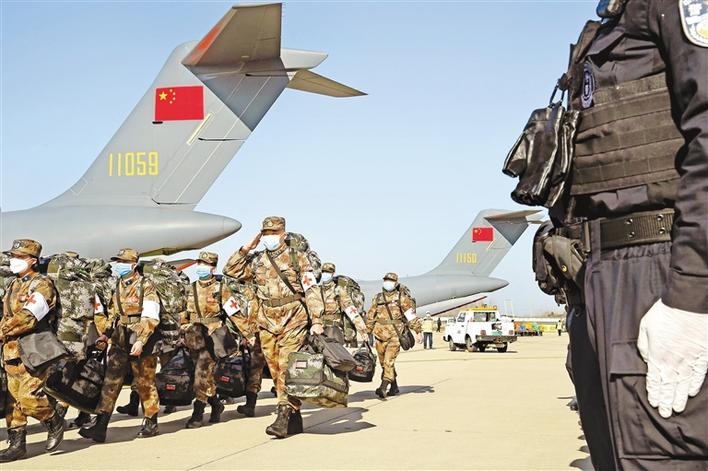 2月17日,軍隊(duì)支援湖北醫(yī)療隊(duì)員抵達(dá)武漢天河機(jī)場(chǎng)。新華社記者 黎云 攝