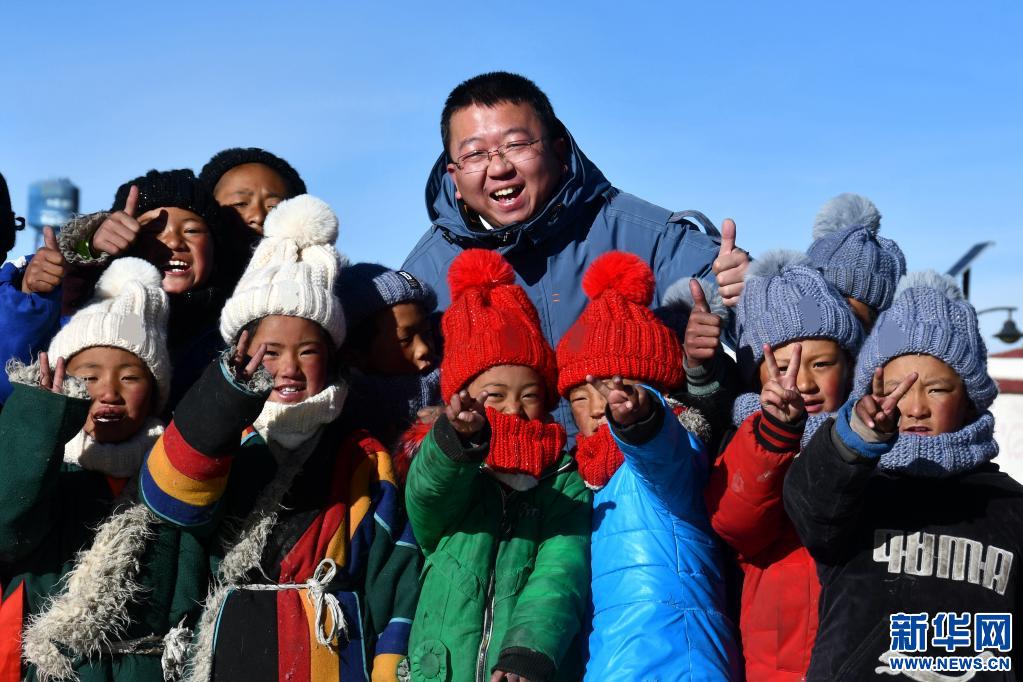 援藏教師潘杰和藏族學生在一起(2021年12月12日攝)。