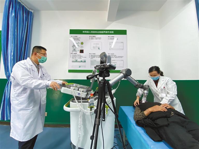 蘇州市援藏工作組引進第一臺5G遠程超聲機器人。圖為醫生使用遠程超聲機器人為患者檢查。