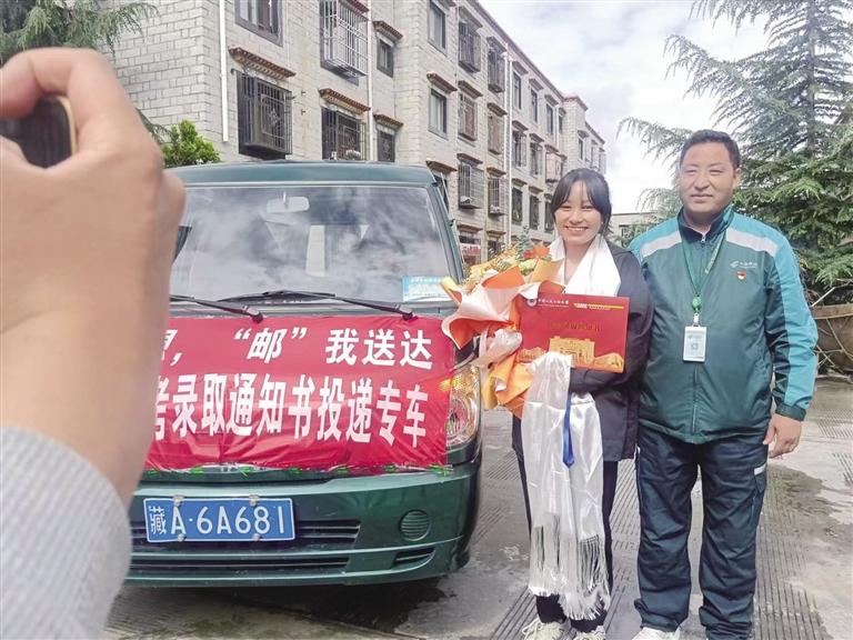 “喂,你好,請問是白瑪玉珍同學嗎?我是拉薩郵政的,您有中國人民公安大學的錄取通知書,我們馬上要投遞了,請您準備一下準考證和身份證。”7月18日上午10時許,在投遞錄取通知書之前,中國郵政集團有限公司拉薩市分公司教育城營業部經理吳金致電考生白瑪玉珍,讓她做好接收準備。隨后,吳金駕駛一輛貼有“您的理想‘郵’我送達”橫幅的西藏郵政高考錄取通知書投遞專車出發,前往白瑪玉珍家所在的扎基小區進行投遞。來到白瑪玉珍家樓下,在仔細核對相關證件后,吳金將錄取通知書遞給白瑪玉珍。與此同時,中國郵政集團拉薩市分公司運營管理部經理羅布次仁等人則為她獻上哈達,送上祝福和鮮花。