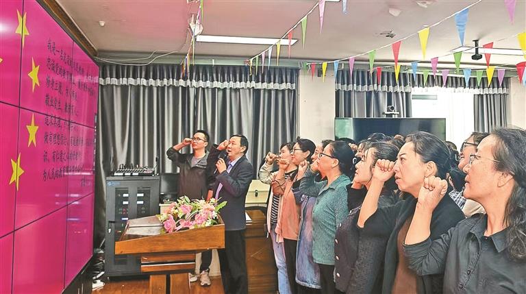 圖為拉薩市師范學(xué)校附屬小學(xué)的教師們在教師節(jié)這天莊嚴(yán)宣誓,堅守教育初心。胡舟 記者 次仁平措 攝