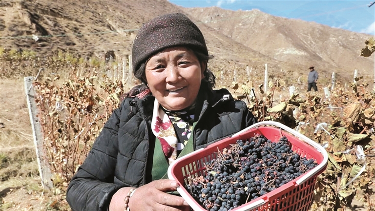 同年,南木溝從山東和昌都芒康引進赤霞珠、蛇龍珠、佳美等幾個世界釀酒品種,依托南木溝獨特的光熱水土資源,通過“基地+農戶”的形式,南木村在南木溝五組陸續建成了近100畝拉薩最大的露天葡萄種植基地。像央金這樣不方便外出的村民,能夠在葡萄基地就業。在這里務工,他們共有3份收入,土地流轉、務工收入加上年底股權分紅,一年能掙好幾萬元。