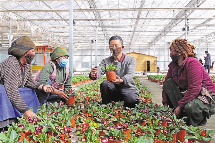 林周縣陽光溫室示范園區(qū)技術(shù)人員在指導(dǎo)村民種植花卉。