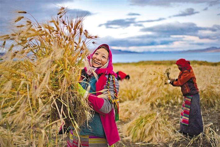 9月23日,西藏那曲市尼瑪縣文部鄉文部南村村民開鐮收割農田里的青稞。文部鄉文部南村位于當惹雍錯湖畔,海拔4645米。文部鄉一帶獨特的自然環境,在以牧區為主的藏北,造就了這片罕見的農田。