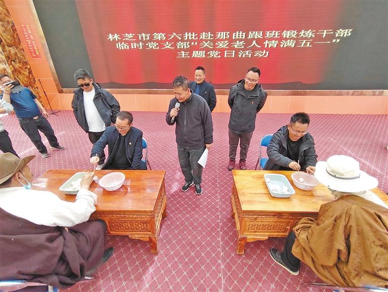 近日,林芝赴那曲跟班鍛煉小組臨時黨支部組織黨員干部前往色尼區特困人員集中供養中心開展關愛老人主題黨日活動?;顒又校h員干部為老人們發放慰問品、表演文藝節目,同老人們拉家常,幫老人們打掃衛生。此次活動既是一次志愿活動,也是一次黨性鍛煉,充分展現了黨員干部踐行為民服務、奮發有為的時代風采,增進了干群關系。