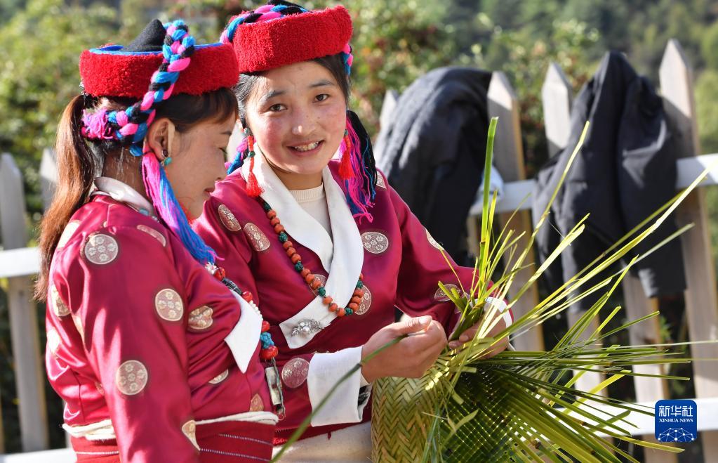 勒布溝的門(mén)巴族婦女在編織竹筐。新華社記者 覺(jué)果 攝