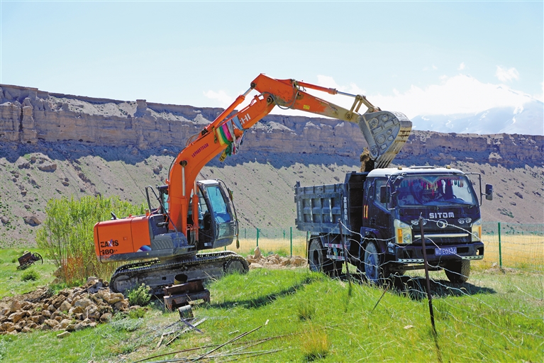 普蘭縣普蘭鎮仁貢村孔雀施工隊的機械車輛在施工,當地群眾在普蘭縣普蘭鎮施工隊務工,一天可增收230元。記者 溫凱 攝